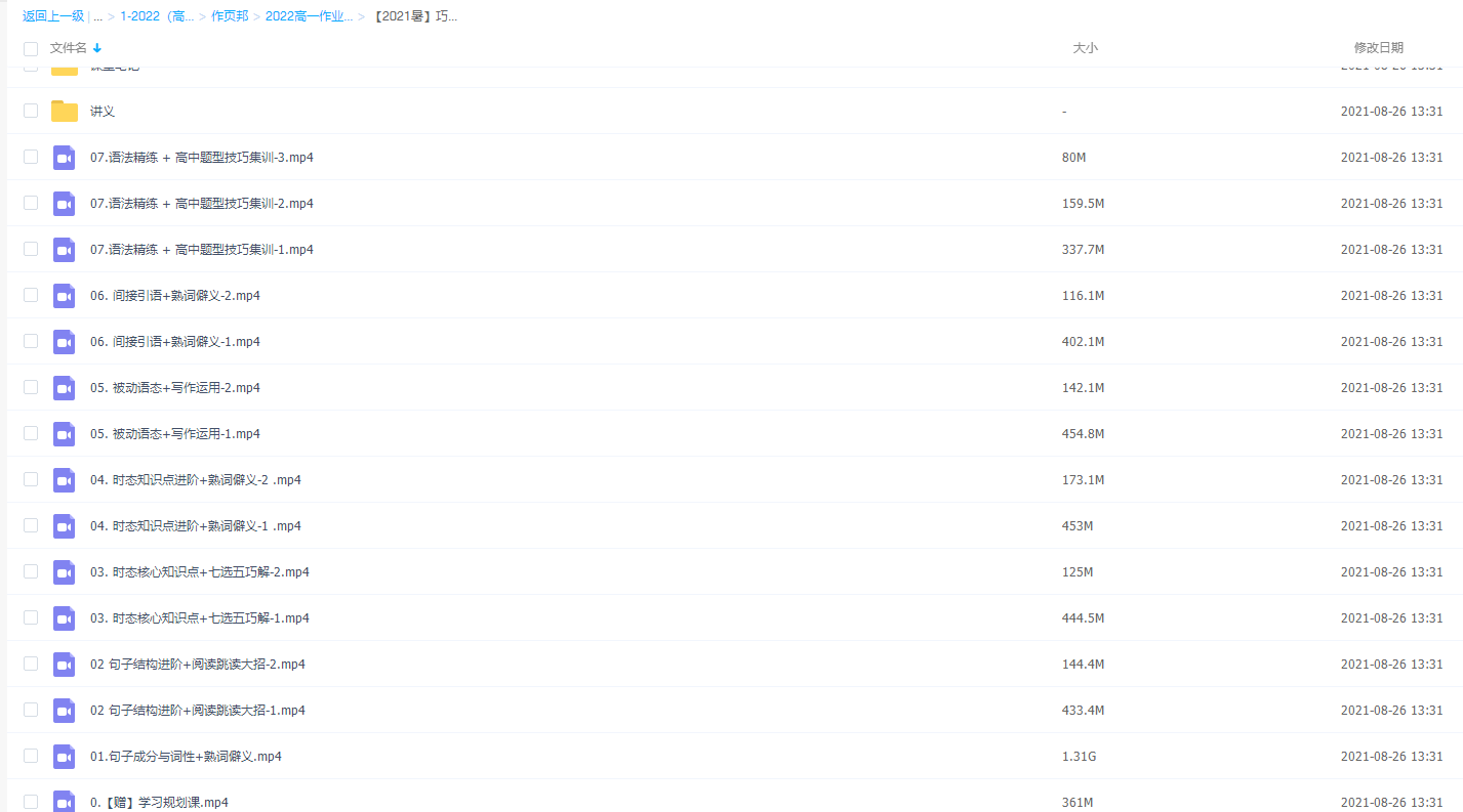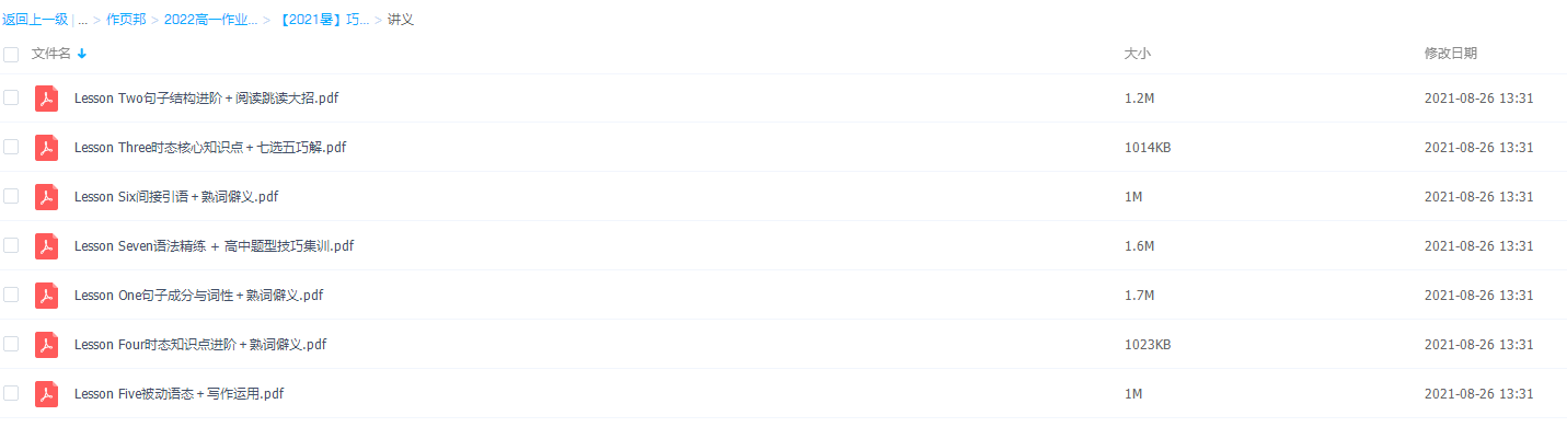 此课件来自作业帮网校,2021作业帮高一牟恩伯英语暑假视频课程,包含视频课程和讲义资料 。主讲牟恩伯老师写作逻辑以英语语言逻辑为根,以高考考试规律为本,帮助学生精确打击高考考点。此课件主要知识点包括:语法精练 + 高中题型技巧集训、间接引语+熟词僻义、被动语态+写作运用、时态知识点进阶+熟词僻义、 时态核心知识点+七选五巧解、句子结构进阶+阅读跳读大招 等视频