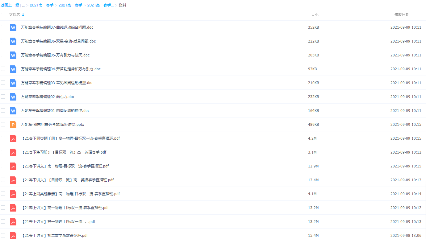 此内容来自于学而思网校,2021学而思高一春季物理章进直播课课程,包括课程视频回放与课堂资料讲义。主要知识点包括描述圆周运动的物理量、向心力基本应用、竖直面与生活中的圆周、行星运动定律、万有引力定律的应用、 万有引力与航天、曲线运动综合、功率及机车启动、动能定理应用等。