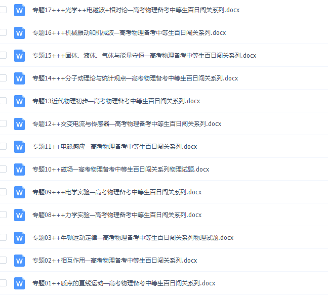 此课件来自《百日冲系列》物理中等生高考备考百日捷进Word版,此课件包含:光学、电磁波、机械振动、分子动理论、近代物理初步、交变电流与传感器、电学实验、力学实验、牛顿运动定律、相互作用、质点的直线运动。