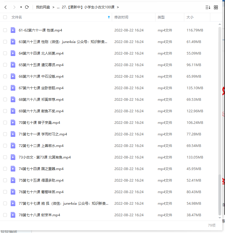 小学生小古文100课,目前只更新到78课,MP4视频文件,,每集大概10-20分钟